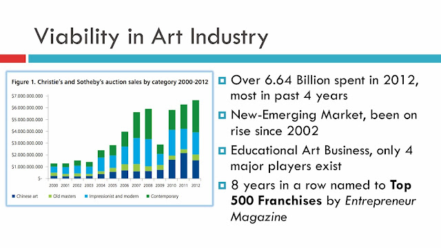 Of course, art is a source of revenue in itself and selling art could provide a means to generating revenue. With an overwhelming market share of $6.64 billion, the past three years have been years of growth for the global art market (ArtTactic 19). To focus in and refine my research, I want to hone in on local markets and the viability of art centers or art education businesses. Ideally, if a viable and feasible idea were to come from this research, I would be a fool not to pursue or investigate further the application of such an idea and business model into the private sector. Although, I do find that it chivalrous and noble to operate a non-profit in which to be able to donate a portion of profits to charitable causes. Regardless, the idea is a structured model that can maintain sustainability and keep generating profits. The fundamental kick starting for this company however, would reside with the notion that this educational of art center refuge would provide and share the amazing and life-changing benefit of understanding and seeing art. The goal would be to offer that knowledge and understanding to younger generations for the longevity and growth for the arts.